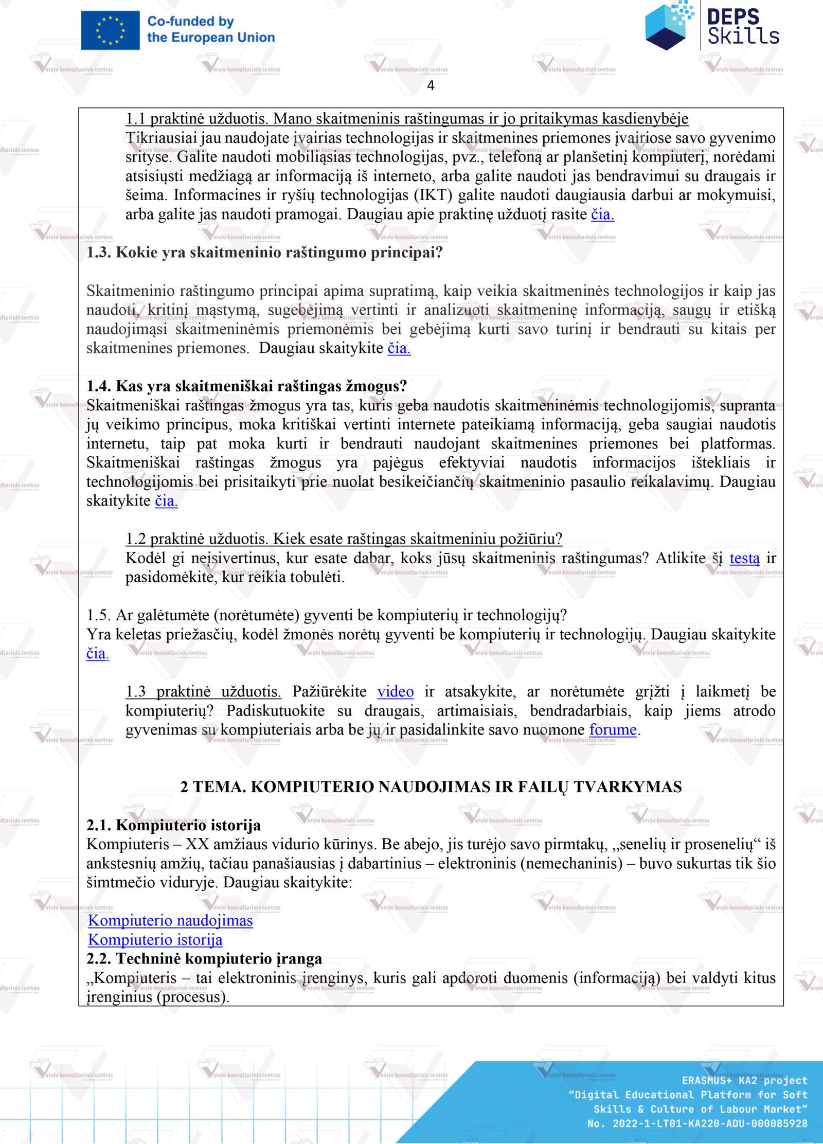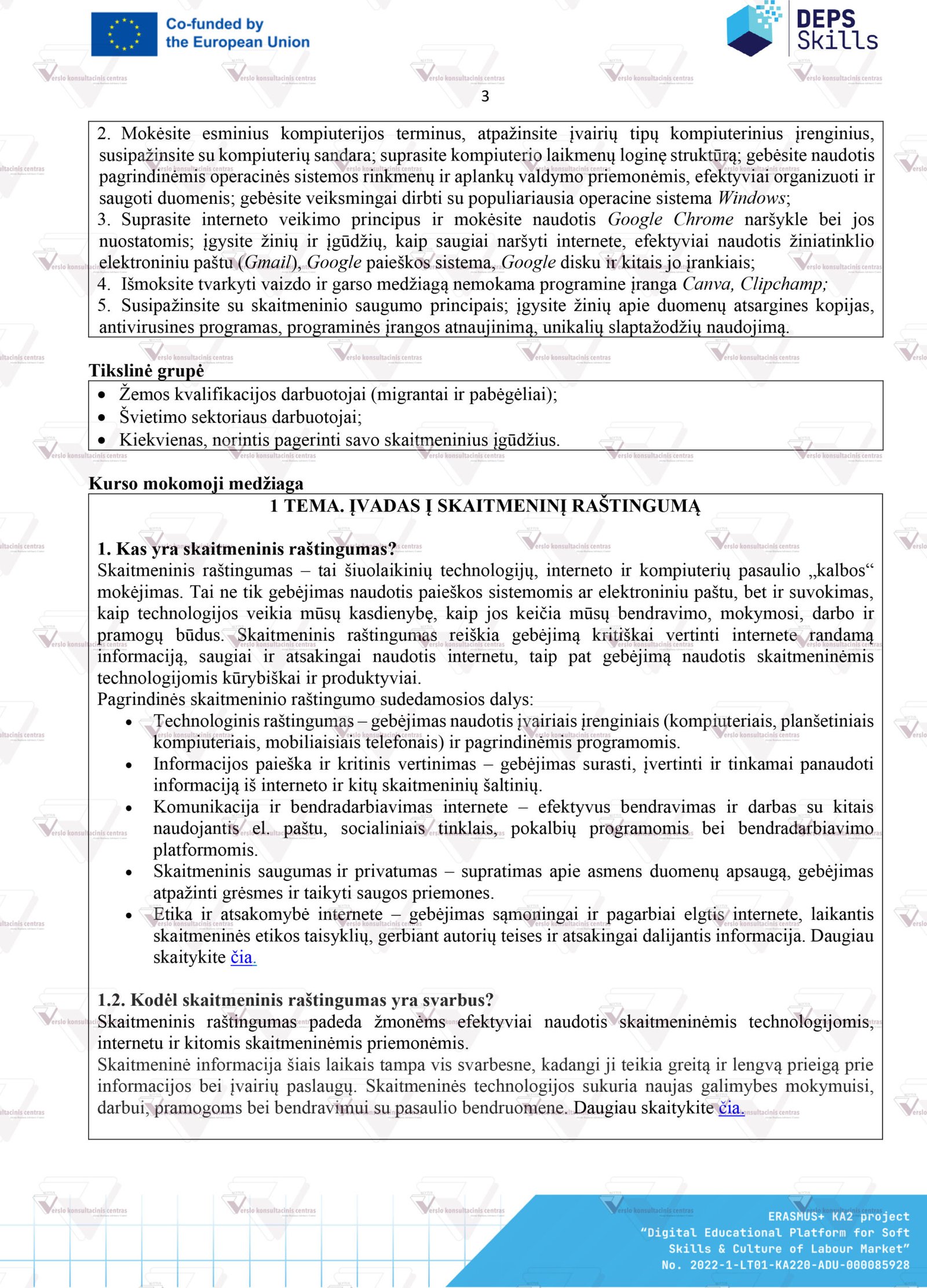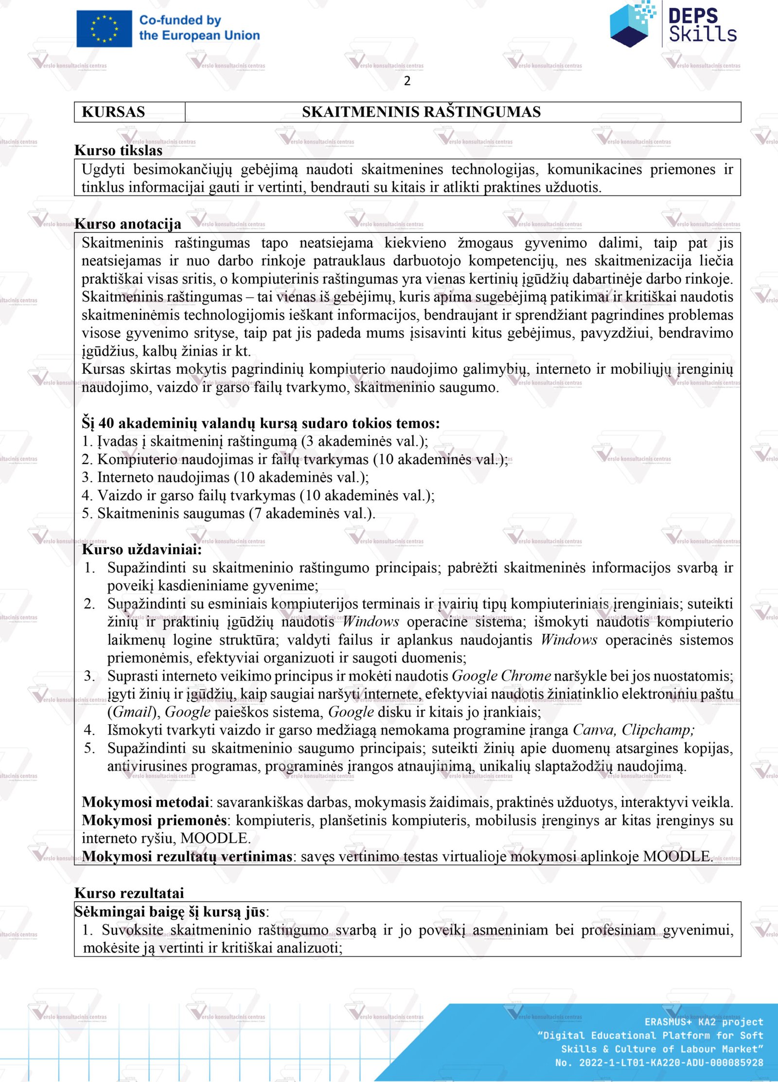 1. Prieiga prie kurso skaitmeninėje DEPS-Skills Moodle mokymosi platformoje (courses.deps-skills.eu).
