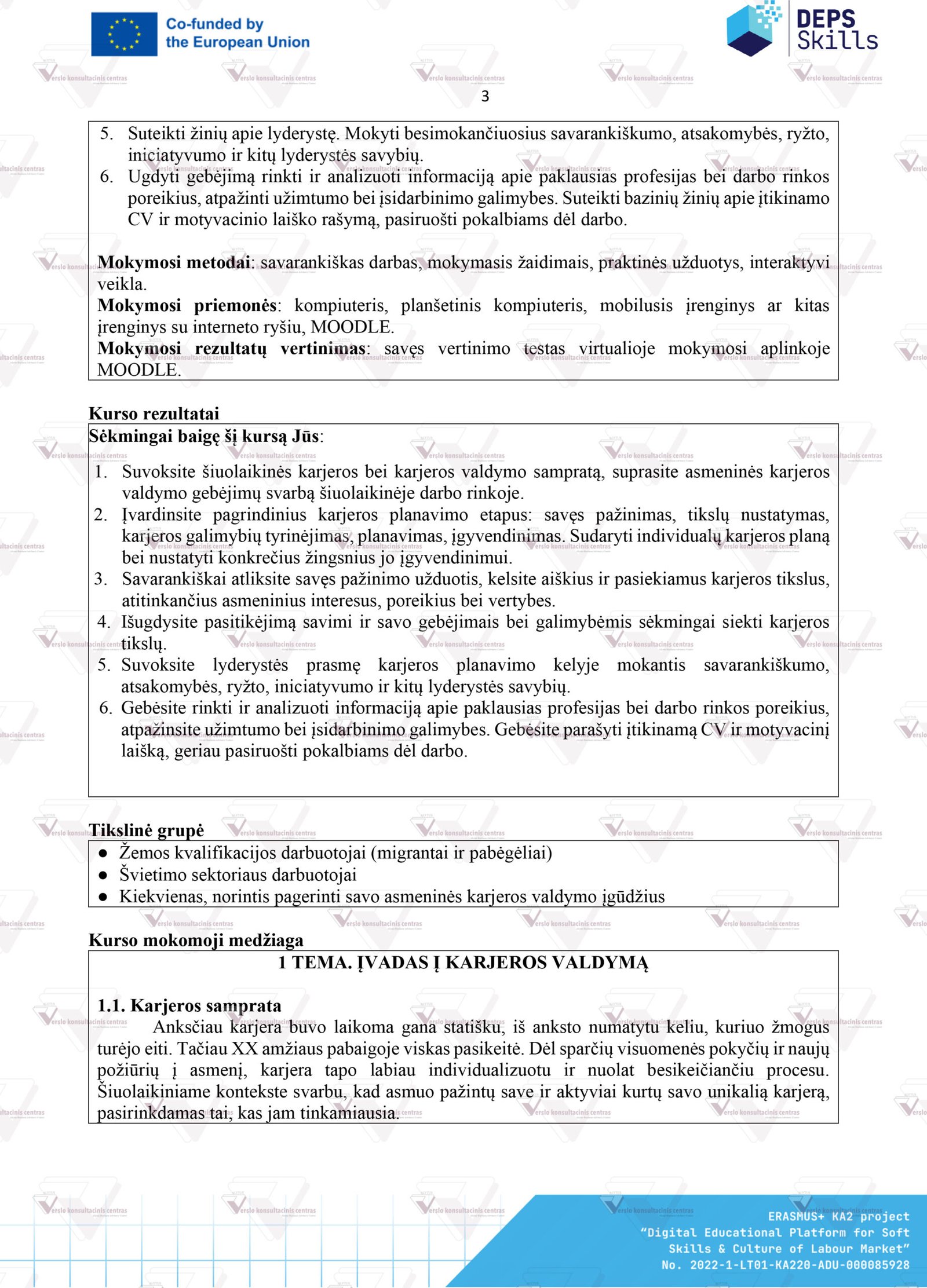 1. Prieiga prie kurso skaitmeninėje DEPS-Skills Moodle mokymosi platformoje (courses.deps-skills.eu).